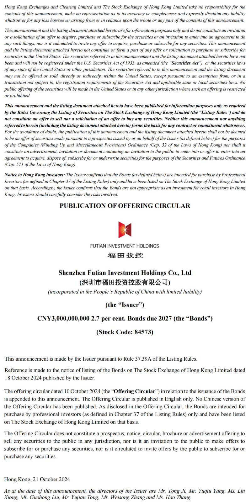 福田投控30亿元境外债券发行通函OC Publication Announcement