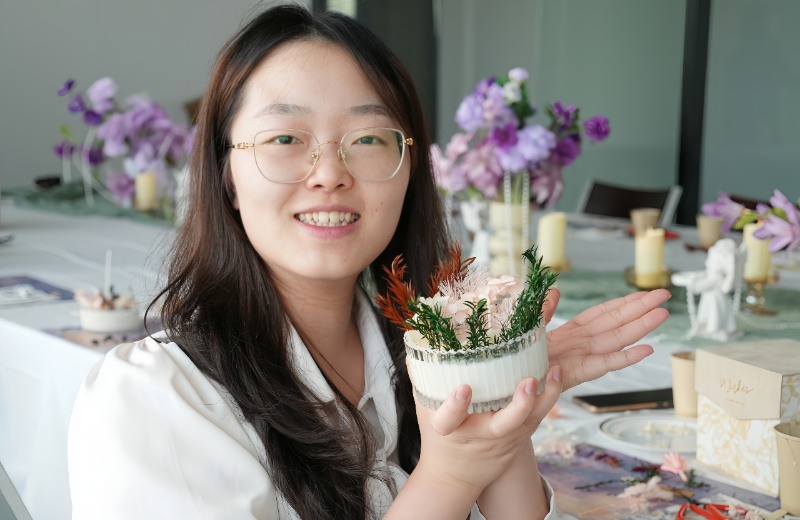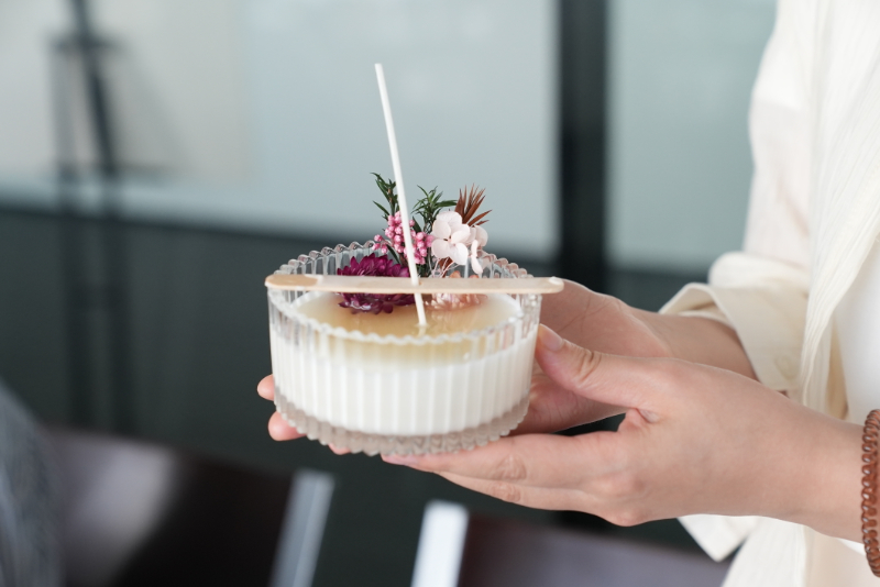 在老师的演示和指导下,大家固定烛芯,小心翼翼地将蜡液注入模具,挑选想要的永生花材,细致修剪,将其精心装饰到蜡烛上,并根据各自的喜好,把喜欢的香薰精油加入蜡油,充分搅拌使香气融入蜡油之中。活动现场,馥郁的栀子香、清新的茉莉香、清凉的薄荷香、甜蜜的橙香……六种扑鼻而来的香气缭绕在空气中,编织出一幅令人陶醉的浪漫画卷。