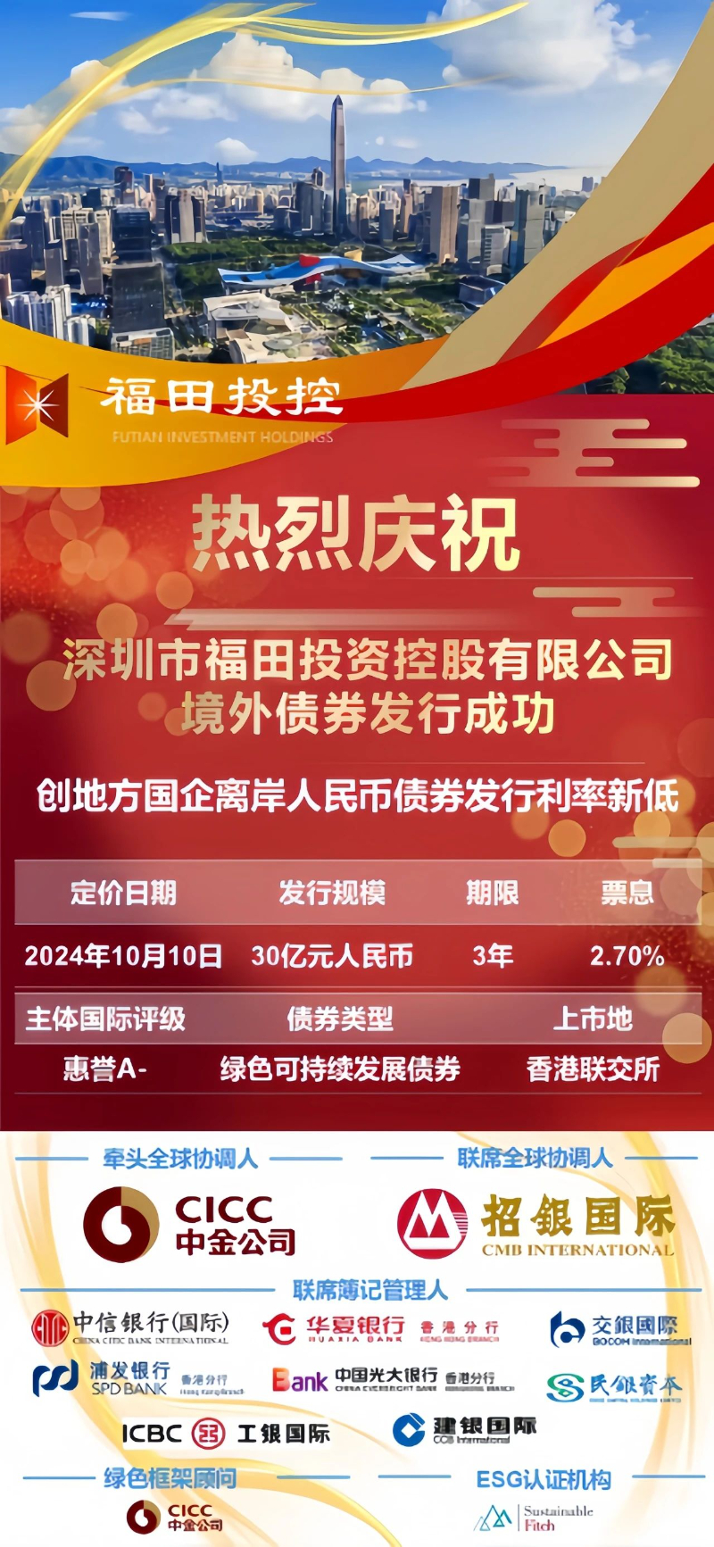 2024年10月10日,深圳市福田投资控股有限公司(简称“福田投控”)在香港成功定价30亿元绿色可持续发展离岸人民币债券,票面利率2.7%,创全国地方国有企业离岸人民币债券新低。此次发行备受国际资本市场瞩目,订单峰值超过60亿元。
