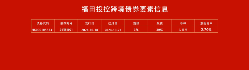 2024年10月21日,深圳市福田投资控股有限公司(简称“福田投控”)30亿元绿色可持续发展离岸人民币债券在港交所、深交所同步挂牌,并于深交所举办了挂牌活动,这不仅是深圳市区属国企首单跨境债券,更是全市场首支于港交所、深交所大湾区债券平台两地挂牌的跨境债券。