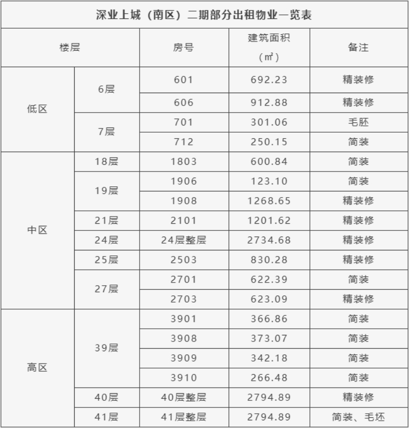 项目概况:总楼层为地上61层、地下3层;总高度约298m;总建面约16万㎡ ,其中福田投控持有4-46层(约7.3万㎡)物业;标准层建面约2800㎡;分户以500-700㎡为主,少量整层房源;标准层层高约4.5m;拥有43部电梯;(南区)停车位4000个;幕墙玻璃(标准单元板块)为3*4.5m,材质为三层超白钢化LOW-E中空玻璃。
